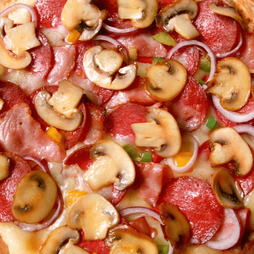mit Schinken, Salami, frischen Champignons, Zwiebeln und Jalapenos